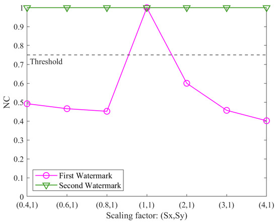 Figure 5, Figure 6, Figure 7 and Figure 8 illustrate the robustness of the proposed algorithm and the comparison methods under RST (rotation, scaling, and translation) attacks. Overall, the three algorithms demonstrate consistent resistance to rotation, uniform scaling, and translation attacks. However, their performance varies under non-uniform scaling attacks.