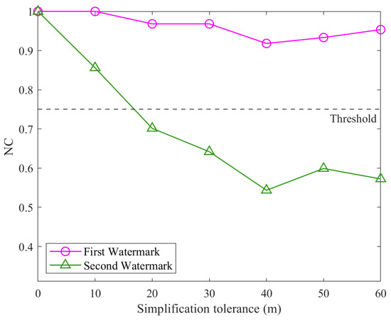 In Figure 11, under rotation attacks, the first watermark maintains an NC value of 1.00 across all rotation angles. In contrast, the second watermark’s NC falls below the threshold at 60°, 120°, 240°, and 300°. This is due to changes in the data’s extrema, which affect the min–max normalization used by the second watermark, making it sensitive to variations in the data range and causing distortion. In Figure 12, the NC values of the second watermark remain consistently at 1.00, while the NC values of the first watermark fall below the threshold except when the scaling factor is (1, 1), where its NC value equals 1.00. This behavior can be attributed to the second watermark’s incorporation of normalization, which effectively mitigates distortions caused by non-uniform scaling attacks. In Figure 13, as the simplification tolerance increases, the NC values for both watermarks show a declining trend. Notably, the NC values of the second watermark drop below the threshold when the simplification tolerance exceeds 20 m and remain below the threshold thereafter. This observation corroborates the theoretical analysis in Section 2, which highlighted that normalization could diminish the watermark’s resistance to simplification attacks. The analysis validates the complementary nature of the two watermarks. By determining the final NC value as the maximum of the two watermarks’ NCs, the proposed algorithm ensures reliable detection even if one watermark is adversely affected by an attack. This result underscores the effectiveness of the multi-instance scheme in enhancing the robustness of the algorithm.