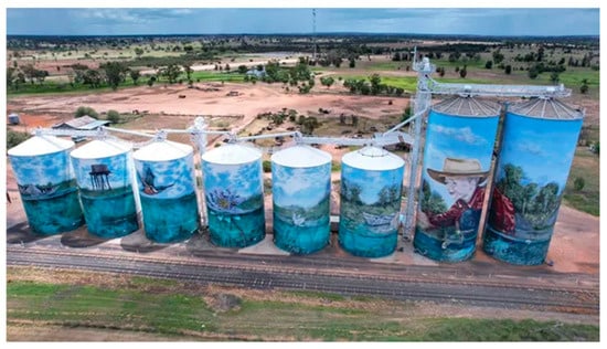 This research explores the transformation of UAV-acquired photogrammetry data into VR-ready outputs, specifically for surveying applications through a case study that has the complexity to fit the purpose. The chosen site (Figure 1) for this study was GrainCorp’s iconic painted silo in Yelarbon (28°34′16″ S, 150°45′22″ E), which is one of many public arts to create the well-known Australian Silo Art Trail. The Yelarbon site, with its challenging vertical structures and stunning artwork (titled: “When the Rain Comes”), provided a unique and visually engaging subject for testing this VR transformation process. GrainCorps expressed interest in utilising the VR output to validate VR’s relevance in surveying while supporting a cultural and marketing initiative.