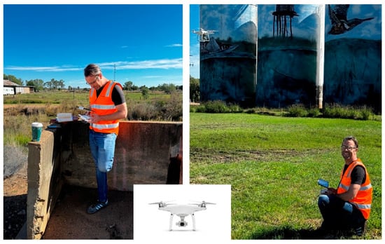 The data acquisition process for this project (Figure 2) relied on UAV photogrammetry, which allows for the efficient capture of high-resolution imagery and 3D data from the air [19]. The UAV used for this project was the DJI Phantom 4 PRO v2.0, a widely recognised commercial-grade drone in the surveying industry (Figure 2). Its 1-inch, 20 MP camera and mechanical shutter make it ideal for capturing detailed textures and large structures like the Yelarbon silos without introducing image distortion.