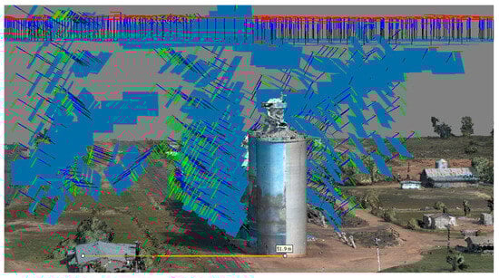 Figure 12 shows the photogrammetric model with baseline spheres created in Maptek Point Studio, which are used as references to identify potential deformities during data processing in Blender. It also presents high-precision land surveying measurements and the silo sphere measurements from eight silos, demonstrating how Blender maintains the relative alignment and surface integrity of the silos after import.