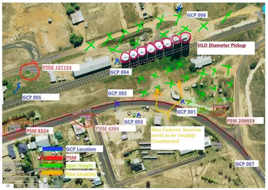 Ground Control Points (GCPs) are critical for georeferencing the photogrammetric data, ensuring that the final model is accurate in scale and location. The coordinate system used in this study is the Map Grid of Australia 2020 (MGA2020) Zone 56. For this site, seven GCPs were placed around the site, as shown in Figure 4, providing a reliable spatial framework and an aesthetically pleasing model without warping, scale distortion, misalignment, or artefacts. The local Permanent Survey Marks (PSMs) are used to reference the GCP and spot height checks; later these spot heights are used to verify the accuracy of not only the Agi-soft-generated surface model but also test for distortions from Blender.