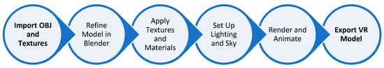 For example, ref. [17] demonstrated how Blender was employed in archaeological survey projects to create VR environments, enabling detailed 3D reconstructions of historical sites to enhance both public engagement and data preservation efforts.
