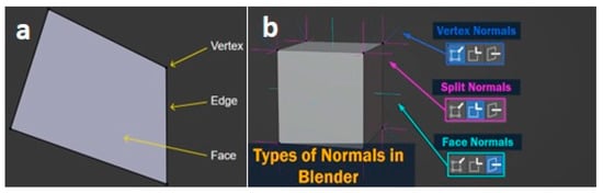 (a) Blender basic elements, (b) Blender normals with different variations, such as split normals, which separate normals for each selected vertex, and vertex normals, which are 3D coordinates representing lines that are perpendicular to the model’s surface geometry.