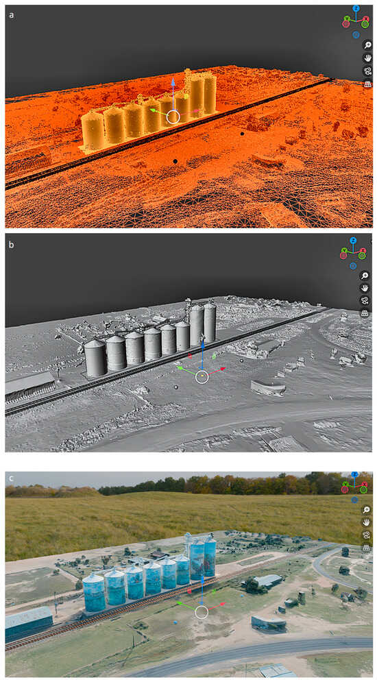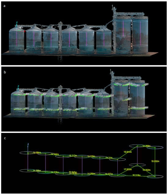 (a) The photogrammetric model with baseline spheres created in Maptek Point Studio. These silo spheres act as essential references for identifying potential deformities introduced during data processing in Blender. The baseline measurements from Maptek provide a crucial comparison point to validate the accuracy of the AgiSoft-generated surfaces when transformed within Blender’s coordinate system. (b) High-precision measurements obtained by land surveying. (c) The silo sphere measurements from each of the eight silos. These measurements are used to determine whether Blender maintains the relative alignment and surface integrity of the silos after being imported.