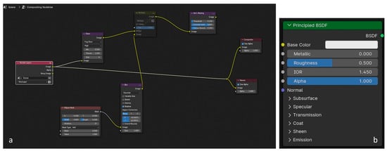 (a) Blender nodes connected to the Principled BSDF to create texture effects for the model. (b) Principled BSDF is a shader node that combines multiple layers into one to model a variety of materials.