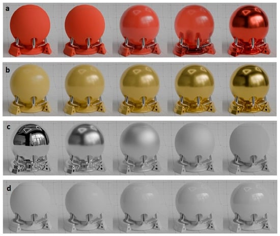 Blender’s metallic property allows materials to transition between a dielectric look and a metallic finish. A metallic value of 0.0 indicates a material with a diffuse or transmissive base layer, topped by a specular reflection. A value of 1.0 results in a fully specular material that reflects the base colour without diffuse reflection (Figure 9b).