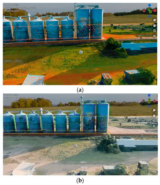 The first step relied on robust UAV survey practises, primarily using nadir and oblique photogrammetry for data capture. Oblique imagery was particularly important, as noted by [20], due to the vertical structure of the Yelarbon silos. This method ensured that the silo’s surfaces were adequately captured in both horizontal and vertical aspects, allowing for more accurate and immersive VR experiences. One key challenge identified in this step was the balance between media-quality image textures and survey-grade data integrity. Although photogrammetry inherently allows for detailed texture mapping, the methodology had to accommodate oblique images for vertical structures like silos, which are less common in standard surveying practice. The additional use of GCPs and image overlap helped mitigate errors in surface accuracy. This step illustrates the intersection between traditional surveying techniques and the requirements for creating VR-compatible output.