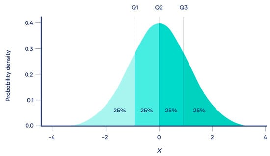 Quartiles split the data into four parts with an equal number of observations. Source: https://www.scribbr.com/statistics/quartiles-quantiles/ (accessed 31 January 2025).
