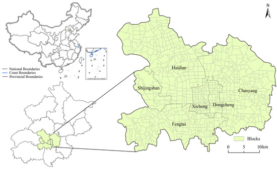 Beijing, recognized as one of China’s megacities, plays a crucial role in attracting high-quality resources nationwide. The total area of Beijing City covers an area of 16,418 km², with a permanent population exceeding 20 million in 2020. With the rapid development of Beijing City, big-city disparities such as the spread of land and urban vitality imbalance have become increasingly severe. In 2016, the Beijing municipal government promulgated the Master Plan of Beijing (2016–2035), proposing to enhance urban vitality by optimizing the urban spatial structure. In 2022, the Beijing municipal government subsequently promulgated the Beijing Urban Renewal Special Plan (Beijing Urban Renewal Plan for the 14th Five-Year Plan Period) to improve urban vitality within the urban renewal program. Summarizing the policies issued by the Beijing municipal government, we found that the government has prioritized the enhancement of urban vitality in urban planning initiatives. Thus, our research focuses on the central districts of Beijing City, encompassing Dongcheng, Xicheng, Chaoyang, Fengtai, Shijingshan, and Haidian Districts. Within the designated study area, statistical analysis is performed on 746 blocks. These blocks represent the smallest administrative units used for population censuses and the delivery of public services in urban China (Figure 1).