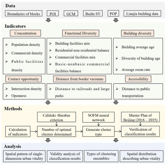 There are four key steps outlined in Figure 2. The first step involved the collection and processing of multisource data. Secondly, we constructed 14 indicators spanning six dimensions, including concentration, functional diversity, contact opportunities, building diversity, accessibility, and distance from border vacuums, to calculate urban vitality. Third, the SOFM neural network was employed to generate clustering results for urban vitality in Beijing City. Finally, using the clustering results, the spatial distribution of urban vitality was analyzed.