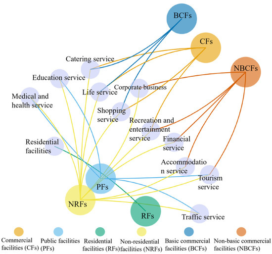 The Amap POI data provided accurate information on urban functions and identified urban structures with high granularity [28]. The Amap POI data for 2022 were obtained from the AutoNavi website (https://www.amap.com/ (accessed on 23 January 2025)), which covered various attributes related to latitude, longitude, and the type of facilities (e.g., residential facilities, shopping facilities, and restaurants). According to the classification of the AutoNavi POI and existing research [29], we classified POIs into six categories, including commercial facilities (CFs), public facilities (PFs), residential facilities (RFs), non-residential facilities (NRFs), basic commercial facilities (BCFs), and non-basic commercial facilities (NBCFs), as illustrated in Figure 3. The CFPOIs comprised catering services, live services, shopping services, and recreation and entertainment services, which were used to calculate the mix of commercial facilities and the density of commercial facilities. The PFPOIs consisted of traffic services, education services, tourism services, and medical and health services, utilized to calculate the density of public facilities. The difference between residential and non-residential facilities lay in the primary function of the land, specifically whether it was designated for residential use. The RFPOIs and NRFPOIs were employed to calculate the residential–non-residential balance. The distinction between commercial and non-basic commercial facilities was determined by whether they provided residents with essential goods and services [30]. These were used to calculate the balance between basic–nonbasic commercial facilities. The mix of building facilities is an entropy indicator calculated from the uses derived from all POIs.