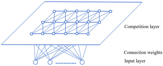 The network structure of the SOFM neural network is shown in Figure 4. It consists of an input layer and a competition layer, with all neurons in the input layer connected to neurons in the competition layer by connection weights. Initially, the neurons in the competition layer are assigned random weight values. During the training phase, an input neuron is selected, and the neuron in the competition layer with the smallest distance to the input neuron is designated as the winning unit. The weights of neighboring competition layer units are then adjusted based on this winning unit in each operation. This process is repeated until the specified number of iterations is reached, marking the end of the training phase. The neurons that win the final competition are taken as categories to realize the classification of the input data [41]. The learning process of the SOFM neural network consists of the following steps: (1) The SOM Toolbox 2.0 was utilized to train the SOFM neural network on the MATLAB R2019b platform, and input layer data were constructed in accordance with normalized urban vitality indicators. (2) The coarse tuning neighborhood radius and fine-tuning neighborhood radius were used for training, with the program repeated 2000 times to obtain stable classification results. (3) The SOFM neural network classification results were input into ArcGIS 10.8, where the urban vitality was categorized into clusters labeled 0, 1, 2, and 3.
