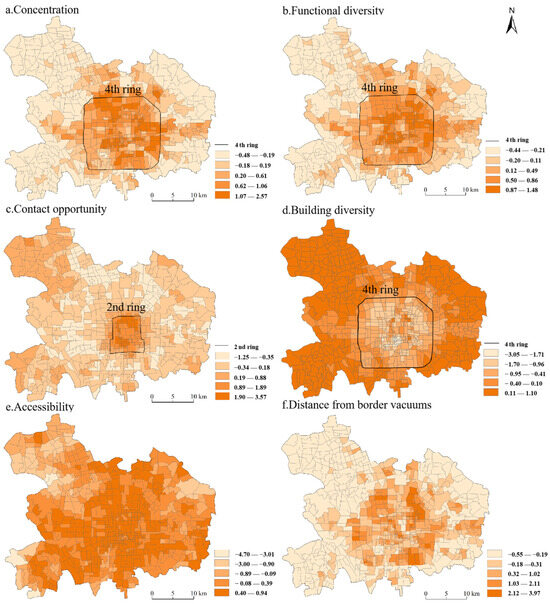 High-value areas are primarily situated within the second ring road, including the Dongcheng and Xicheng Districts (Figure 5c). The primary reason is that the Dongcheng and Xicheng Districts are governed by stringent regulations that restrict the construction of high-rise residential buildings. The other four districts are characterized by relatively larger blocks and high-rise buildings, potentially limiting interpersonal interactions. This phenomenon aligns with Jacobs’ observation that high-rise buildings may lead to reduced street-level interactions [10].