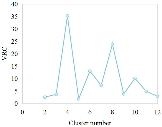 Before implementing the SOFM neural network, it is essential to determine the optimal number of clusters. The Caliński–Harabasz criterion is commonly used to evaluate the effectiveness of clustering, particularly in unsupervised learning tasks. Therefore, we utilize the Caliński–Harabasz criterion to determine the optimal number of clusters. The primary advantage of the Caliński–Harabasz criterion, also referred to as the Variance Ratio Criterion (VRC), lies in its ability to evaluate cluster quality and determine the optimal clustering solution among multiple options [40]. A higher VRC index corresponds to a greater Caliński–Harabasz score, signifying improved clustering performance. The VRC index is calculated as follows: