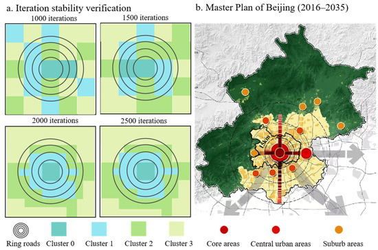 Determining the optimal number of iterations for the SOFM neural network aims to ensure the stability of clustering results while avoiding unnecessary computational overhead. According to relevant studies, a common approach is to evaluate classification stability under different iteration counts. The SOFM neural network is trained using various iteration numbers, and the resulting classification distributions are compared. When the classification results stabilize and show minimal variation across iterations, the corresponding iteration count is deemed optimal [46,48]. We conducted stability tests by selecting 1000, 1500, 2000, and 2500 iterations, as illustrated in Figure 7a. The findings indicate that when the number of iterations is set to 1000, the urban vitality spatial classification displays the characteristics of a mosaic model. At 1500 iterations, the spatial classification of urban vitality begins to exhibit discernible spatial patterns. With 2000 iterations, the classification results demonstrate clear spatial aggregation characteristics. However, when the iterations are increased to 2500, the results exhibit minimal variation compared to those at 2000 iterations. Furthermore, a comparison with the Master Plan of Beijing (2016–2035) map revealed that the spatial classification at 2000 iterations demonstrates greater alignment with the urban planning objectives (Figure 7b). Consequently, we selected 2000 iterations as the most suitable iteration count for ensuring stability.