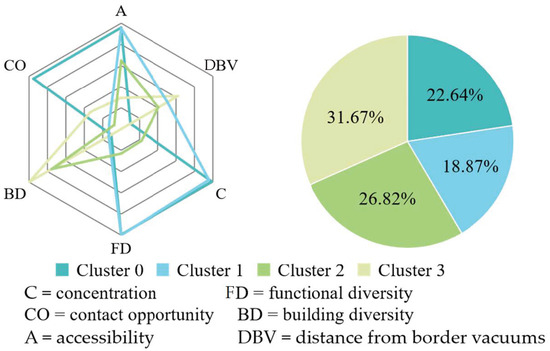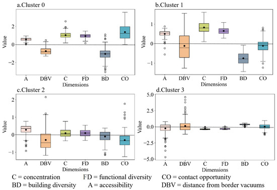 Figure 8 illustrates that cluster 0 comprised 22.64% of all types. This cluster exhibited high values across several key urban vitality dimensions, including functional diversity, concentration, accessibility, and contact opportunity. These high values suggest that cluster 0 is a vibrant area with a diverse mix of land uses and high population density, which enhances social interaction. However, despite high performance in the aforementioned dimensions, cluster 0 exhibited lower values in the dimensions of building diversity and distance from border vacuums. Additionally, we found that three boxes for the urban vitality dimensions (accessibility, concentration, and functional diversity) were more compact compared to the other boxes. This suggests that urban vitality characteristics in these dimensions are more consistent across the cluster (Figure 9a).