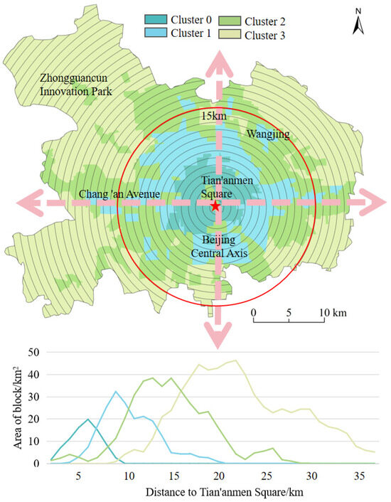 To quantitatively analyze the spatial distribution of urban vitality, concentric rings, spaced 1 km apart, were delineated with Tian’anmen Square as the central reference point (Figure 10). The results revealed a distinct pattern, with cluster 0 areas primarily concentrated within an 8 km radius from the center, peaking at 5 km. This reflects the high-density and mixed-use characteristics typical of central urban areas. Cluster 1 was distributed between 3 and 20 km from the urban center, peaking at 8 km. Cluster 2 areas were located within a 29 km radius, with peaks at 11 km and 15 km, marking the transition from the more vibrant central zones to suburban areas. Cluster 3 areas were found between 7 and 36 km from the city center, peaking at 21 km. These outlying areas exhibit relatively lower urban vitality levels, relying more on transportation to enhance connectivity with the urban core. In summary, the spatial distribution of the four clusters shows a clear relationship with their proximity to the city center. Clusters 0, 1, and 2 are located within 15 km of the city center, representing zones with high urban vitality. Areas beyond the 15 km mark, particularly cluster 3, show significantly lower vitality levels.