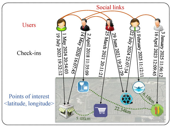 In location-based social networks (LBSNs) [1], such as Yelp, Facebook, and WeChat, users establish social connections, visit points of interest (POIs) (e.g., shopping malls, cinemas, and tourist attractions) and share information about location coordinates (longitude and latitude), check-in times, ratings, comments, tips, etc. (Figure 1). A large amount of information not only promotes the development of LBSNs but also leads to information overload [2]. As a proactive type of information filtering technology, recommender systems (RSs) have advantages in mining the potential preferences of users and providing personalized services [3].
