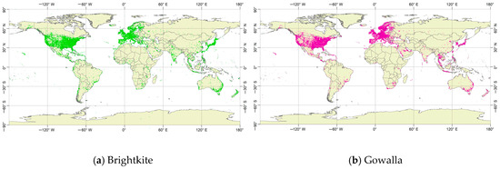 The global distribution of locations in the Brightkite and Gowalla datasets.