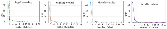 Figure 4 describes the variation in SSE with an increasing number of clusters on each dataset. According to the elbow method [16], there is a noticeable inflection point in the SSE curve where the rate of decrease suddenly slows. Beyond this point, increasing the number of clusters cannot yield considerable enhancements in clustering performance. Therefore, the nc value at the inflection point is commonly considered the optimal number of clusters. In the Gowalla-weekend dataset, the inflection point occurs at nc = 3, while in the other three datasets, the inflection point occurs at nc = 2. These inflection points are depicted by the vertical dotted lines in Figure 4.