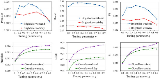 PR-SRTST is independently executed 50 times. The value of η is fine-tuned within the range of 0.1 to 0.9. The final values of the accuracy metrics for different values of η are obtained by averaging the results of 50 independent experiments. The best accuracy is achieved when η = 0.6, 0.4, 0.8, and 0.9 for the Brightkite-workday, Brightkite-weekend, Gowalla-workday, and Gowalla-weekend datasets, respectively (Figure 5).