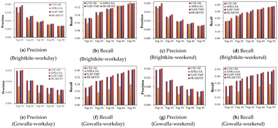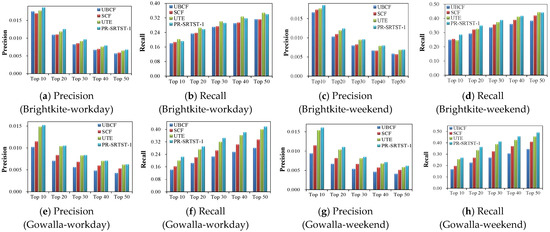 Compared to the other three unified recommenders in the third group of experiments, PR-SRTST demonstrates superior performance. In terms of F1 (Tables S9 and S10), PR-SRTST outperforms UTE + SE by 4.45%, 9.46%, 0.93%, and 5.00% on average for different values of N on the Brightkite-workday, Brightkite-weekend, Gowalla-workday, and Gowalla-weekend data, respectively. Compared to APRA-SA, PR-SRTST exhibits substantial improvements of 13.71%, 13.04%, 72.69%, and 88.61% in terms of F1 for the respective datasets. When N = 50 on the Gowalla-workday dataset, the accuracy of PR-SRTST is slightly lower than that of TeSP-TMF. This could be due to the fact that the dynamic similarity calculation in PR-SRTST is constrained by sparse data, whereas TeSP-TMF alleviates sparseness through matrix factorization. Nevertheless, in all the other cases, PR-SRTST is superior to TeSP-TMF. On average, for different N, the F1 values of PR-SRTST on the four datasets are respectively improved by 2.48%, 6.11%, 0.25%, and 2.17% compared to those of TeSP-TMF.