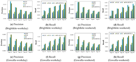 The accuracy of PR-SRTST-2 was compared with that of KDE, PLD, and SE in spatial and temporal contexts (Table S5). Figure 7 illustrates the evaluations of the four recommenders in the second group of experiments. The comprehensive accuracy F1 values for the four datasets are provided in Tables S6 and S7.