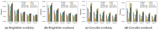We evaluated the timeliness of PR-SRTST and the seven benchmark methods described in Section 4.3. We utilized the innovative metric Timeliness defined in Section 4.2 as the index of the timeliness of POI RSs. A larger Timeliness value indicates a more timely recommender. Timeliness is helpful in evaluating whether the recommendation results align with users’ recent preferences. To assess the timeliness of all the considered recommendation algorithms, we executed each recommender 50 times with the recommended list length N ranging from 10 to 50. After 50 independent experiments, we calculated the average Timeliness values as the final results. The timeliness values of POI recommenders are presented by bar charts, where the horizontal axis denotes the recommended list length (10~50) and the vertical axis indicates the corresponding Timeliness values (Figure 9).