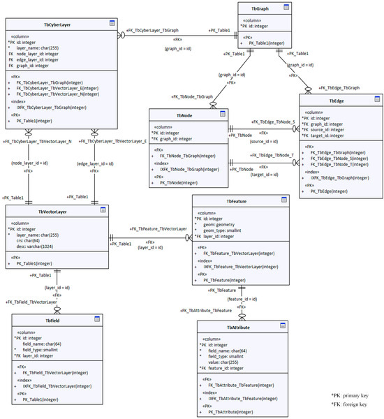 The logical model described above essentially adopts a “proxy mode”, providing a unified interface to manage spatial and cyber features by capturing the spatial and graph models. The advantage of this model is that it can support both map visualization and complex network queries, analysis, and visualization layouts, and it does not require additional code to maintain data consistency between the spatial data model and the graph model.