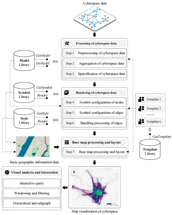 CMV essentially falls under the category of thematic map visualization. Therefore, its visualization method also follows the general process of thematic visualization—that is, thematic layer processing, base map layer processing, and map layout. Based on the above concept, we design a method framework for CMV, as shown in Figure 6. This framework includes three main stages (seven key steps): cyberspace data processing, cyberspace data rendering, base map processing and map layout. Each stage is completed with the support of the corresponding libraries, including the model, symbol, style, and template libraries.