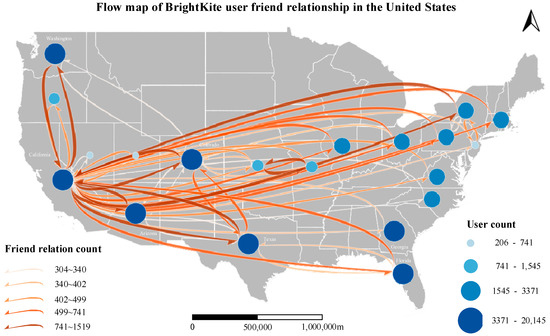 By leveraging the aggregated BrightKite dataset, a flow map of the United States can be constructed [51], as illustrated in Figure 15.