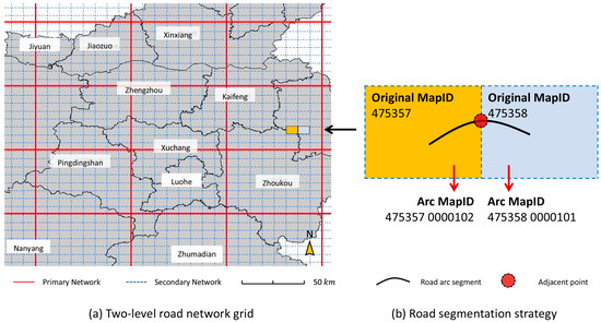 A six-digit encoding system (MapID) is used to identify each secondary grid. The first two digits represent the row and column of the primary grid, while the last two digits denote the row and column of the secondary grid within the primary grid. Each secondary grid, approximately 10 km by 14 km, serves as the fundamental unit for road segment coding. Road segments are assigned a unique code combining the secondary grid code and a sequential number. This ensures efficient organization and retrieval of road data. Each primary grid is represented by a separate database table, and the road segments within each secondary grid are stored as individual records. When a road segment crosses the boundary of two secondary grids, it is split into two segments at the grid edge. The shared endpoint, known as a secondary grid adjacency point, is assigned unique identifiers in both grids. This approach ensures accurate representation and efficient processing of road network data. The shared point shares the same spatial coordinates as the adjacent points.