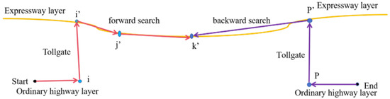 The proposed approach involves searching for a route in an ordinary highway layer, including the starting point, destination, and necessary points. During the search, if an expressway layer is encountered, the search transitions to the expressway layer. Segments with bridges or tunnels that exceed the vehicle’s limitations are marked as forbidden. To improve search efficiency, the expressway layer road network data are loaded into memory completely, while a two-level grid search is employed for the ordinary highway layer to avoid long-distance searches. To address the low efficiency of the unidirectional Dijkstra algorithm for cross-regional road network searches, a parallelized bidirectional Dijkstra algorithm for optimization was also integrated. Figure 3 is a framework of the route search algorithm.