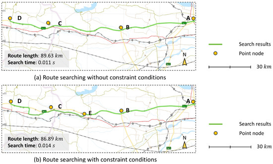 The effectiveness of obstacle avoidance of special vehicles is examined to verify whether the algorithm can avoid points that do not meet the road search conditions. In our experiment, the basic parameters of a special vehicle are set as follows in Table 3. Figure 5 shows the results of the road searching conditions with and without bridge loading, as well as the tunnel height limit. In Figure 5a, A and D are the start and endpoints. The route length is 89.630 km, with a search time of 0.011 s. This indicates that under unconstrained conditions, the route planning is mainly carried out along the expressway. Figure 5b shows the road finding effect under road searching conditions, where C is the unqualified bridge on the expressway layer, with a weight limit of only 25 tons. However, the weight of the special vehicle is 30 tons > 25 tons. The special vehicle left the expressway layer at point E. These experimental results proved that the proposed algorithm successfully makes special vehicles avoid obstacles.