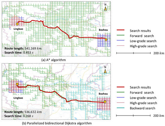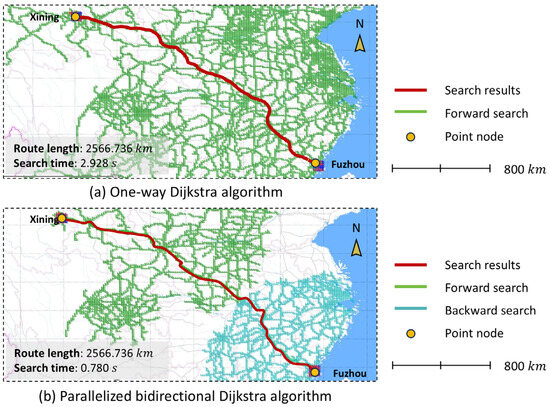 It can be seen from Figure 6 that the one-way Dijkstra algorithm and the parallelized bidirectional Dijkstra algorithm are used for route planning. The route length is 2566 km, with a time cost of 2.928 s for the one-way Dijkstra algorithm and a time cost of 0.780 for the parallelized bidirectional Dijkstra algorithm (Figure 6). The latter improves the calculation efficiency by about 3.5 times. The experiment shows that the parallelized bidirectional Dijkstra algorithm is better than the unidirectional Dijkstra algorithm in route planning, which can effectively improve computational efficiency. The one-way Dijkstra algorithm searches the nationwide road section data (the green road section in Figure 6a is the searched road section), while the parallelized bidirectional Dijkstra algorithm simultaneously searches the starting and ending points. The green road section in Figure 6b is the road section searched from the starting point to the ending point, and the blue road section is searched by the ending point to the starting point direction, spending only about half of the road section searched by the one-way algorithm. The improvement is attributed to the bidirectional search strategy, which reduces redundant node expansions by simultaneously searching from the start and endpoints. Unlike the one-way Dijkstra algorithm, which searches the entire network (green road segments in Figure 6a), the bidirectional approach restricts the search space, as shown in Figure 6b, significantly enhancing computational efficiency. The proposed algorithm was compared with the A* algorithm to further prove its effectiveness.