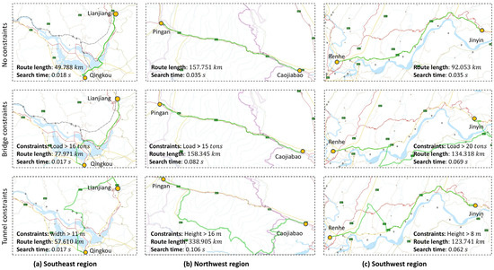 As shown in Figure 8, these experiments illustrate how the route planning algorithm performs under real-world constraints across different regions of China. The Figure presents the optimized routes for each region, taking into account constraints such as bridge load capacities and tunnel clearances. In the Southeast region (Case 1), when there were no constraints, the route length was 49.788 km, and the search time was 0.018 s. When tunnel clearance constraints (width > 11 m) were introduced (Case 2), the route length increased to 77.971 km, but the search time remained relatively unchanged. Similarly, in Case 3, where a bridge load greater than 16 tons was required, the route length slightly increased to 57.610 km, with negligible impact on search time. In the Northwest region (Case 4), with no constraints, the route length was 157.751 km, and the search time was 0.035 s. Applying the tunnel height constraint (>6 m) in Case 5 led to a substantial increase in route length (338.905 km), and the search time increased to 0.106 s. The introduction of the bridge load constraint (>15 tons) in Case 6 resulted in a route length of 158.345 km with a search time of 0.082 s. The Southwest region (Case 7) demonstrated a similar pattern. With no constraints, the route length was 92.053 km, and the search time was 0.035 s. However, when tunnel clearance was required to be greater than 8 m (Case 8), the route length increased to 123.741 km, and the search time increased to 0.062 s. Lastly, in Case 9, where the bridge load exceeded 20 tons, the route length was 134.318 km, with a search time of 0.069 s.