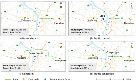 In addition, considering different real-world factors such as traffic control, localized rainstorms, and traffic congestion, Figure 9 demonstrates how these factors affect route planning. In the traffic control scenario, the route length increased by 3.22% (from 38.646 km to 39.892 km), and the search time increased by 8.86%, as traffic control only affected specific segments of the route, limiting the search range to the adjacent roads, which means that some road segments are not considered, i.e., for those segments. For Traffic congestion, the route length increased by 5.5% (from 38.646 km to 40.773 km), and the search time increased by 8.73%, indicating that congestion impacts the linear extension of the current path and its neighboring segments. As for the localized rainstorm, which is a regional event, the route length increased by 77.6%, and the search time increased by 30.38%, demonstrating that the rainstorm-affected areas are considered impassable, leading the algorithm to find alternative routes outside the affected areas, resulting in a significant increase in search time and route length, as the affected segments have . This experiment demonstrates the adaptability of our algorithm to real-world factors, providing a clearer understanding of its effectiveness and robustness in practical applications.