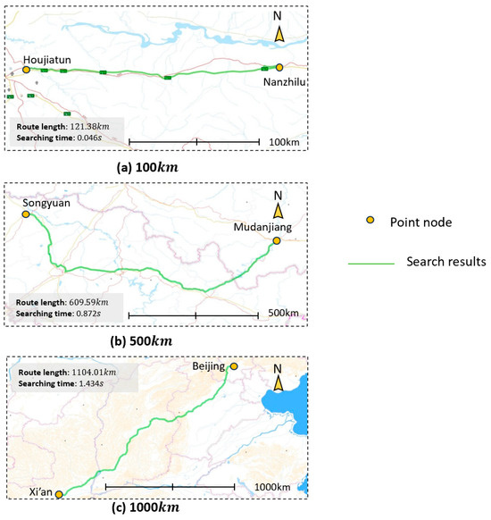 A dual-layer model was proposed to address the challenges of processing large-scale, national road network data. This model divides the network into two distinct layers: high-grade (expressway) and low-grade (ordinary highway) layers. The expressway layer, containing a smaller dataset, is stored separately for efficient access. The ordinary highway layer, which is significantly larger, is indexed using a secondary grid system. The proposed algorithm leverages this hierarchical structure to optimize route planning. It prioritizes searching within a 6–25 km radius of the low-grade network’s starting, passing, and ending points. The algorithm efficiently scans the high-grade network nationwide for distances exceeding this range. This strategy balances practical human travel behavior with the need for efficient long-distance routing. The proposed approach significantly improves route planning performance by reducing data access times and optimizing search processes, especially when dealing with large-scale datasets (Table 3). This enhanced efficiency is crucial for real-world transportation systems, enabling optimized routing decisions with both speed and accuracy.