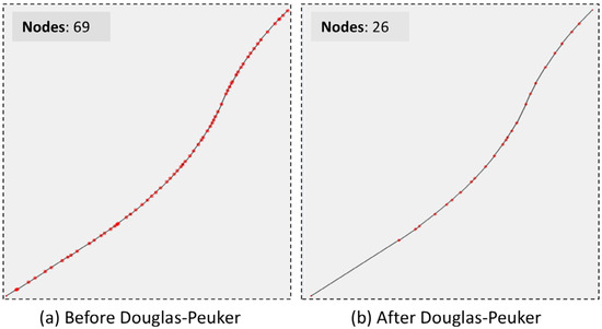 In addition to this layered approach, critical points such as bridges and tunnels were directly integrated into the road network. This enables us to filter out unsuitable road segments based on specific vehicle requirements, like size or weight restrictions, thereby narrowing the search space and improving routing efficiency. This method is particularly valuable for large-scale national road networks, where real-time route planning must accommodate a diverse range of vehicles, road types, and infrastructure constraints. Furthermore, during the execution of the route search algorithm, the road segmentation is simplified using the Douglas–Peucker algorithm. Figure 11 illustrates the simplification results for different threshold values, with a satisfactory threshold achieving a 62.3% data storage reduction. This significantly reduces the memory required to store and load the road network data. While the simplification reduces the number of nodes in the arc segments, the overall shape of each segment remains unchanged.