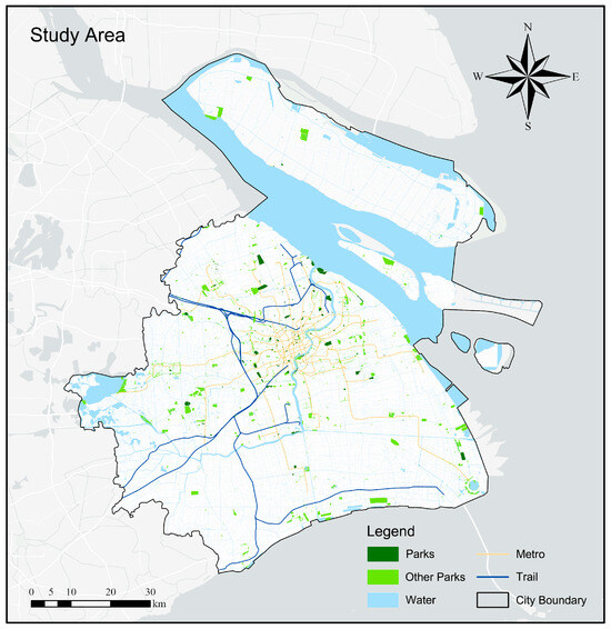 Shanghai is in the eastern coastal region of China, with a total land area of 6340.5 km2 and a permanent population of 24.7589 million, with a registered population of 15.0383 million (as of 2022) [25]. As one of China’s major cities, Shanghai has a high level of urbanization and population density, which has significantly influenced the use and demand for public spaces during public health crises. In addition, Shanghai’s urban structure is unique, with a multi-centered layout and diverse community types, leading to distinct patterns in park use and social interactions across different areas. In terms of park construction, according to the “14th Five-Year Plan for Park City Construction in Shanghai”, the city plans to implement the “Thousand Parks City” project [26]. This policy demonstrates that Shanghai has developed a relatively mature and comprehensive park construction system. Therefore, selecting Shanghai for research can reveal the challenges faced by most urban parks, providing valuable guidance and reference for other cities.
