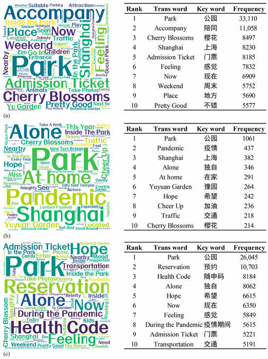 We analyzed the frequency of user comment data from three periods—before, during, and after the first wave of COVID-19 pandemic in Shanghai—selecting the top 100 high-frequency words from each period to identify the core trends in public attitudes toward park usage [39]. According to the results shown in Figure 3, during the first period, the high-frequency words primarily focus on the park’s beautiful scenery (e.g., “cherry blossoms” has 8497 mentions and “tulips” has 3058), recreational experiences (e.g., “boating” has 2743 mentions and “picnic” has 2514), and family-friendly experiences (e.g., “accompany” has 11,058 mentions and “children” has 4723). These data reflect the general expectation of the public to consider parks as locations for leisure and entertainment.