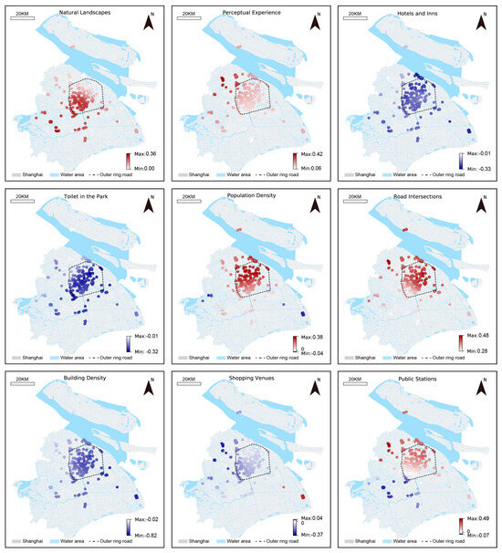 In terms of social interaction recovery, we observed several significant variables (Figure 4). In the central areas, natural landscapes, population density, and road intersections showed a high positive correlation with social interaction recovery. On the other hand, in parks located in the northwest region outside Shanghai’s outer ring, the relatively remote location resulted in higher regression coefficients for perceptual experiences among visitors. Furthermore, across the entire city, hotels and inns, park toilets, and building density showed a consistent negative correlation with park social interaction, suggesting that these factors might detract from the social appeal of parks. Commercial facilities in the southeastern area outside the second ring road demonstrated a positive correlation, but showed a negative correlation in most other areas. Regarding public transportation stations, their influence on park social interaction was positive in the northern regions but negative in the southern regions, indicating that the impact of bus stops on social interaction varies by area.