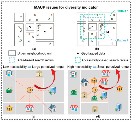 Further, a deeper look at the problem suggests that the above area-based approach to adjusting the search radius can be an oversimplified solution. As demonstrated in Figure 1c,d, the perception range of people for diversity can be different, even in spatial units of the same size. For spatial unit G, due to the low accessibility to various infrastructures (e.g., residential, commercial, green space, etc.), the perception range of people may go beyond the unit’s boundary. For spatial unit of higher accessibility (e.g., H in Figure 1d), the perception range can be more confined. Therefore, we hypothesize that accessibility may also have an impact on the perception of diversity in addition to the size factor. As a second contribution, we propose to incorporate the idea of accessibility into the search radius adjustment. For spatial units with lower accessibility, we increase the degree of search radius expansion, and vice versa (see Section 3.4.3 for details).