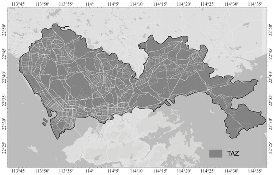 As a prominent special economic zone in China, Shenzhen is an emerging immigrant city, China’s economic hub, and an international metropolis. Meanwhile, a large number of studies have proved that there is a high positive correlation between vitality and urban diversity in this city [6,12,18]. Therefore, in this study, we choose Shenzhen as the study area. Extensive experiments have demonstrated that Traffic Analysis Zones (TAZs) represent fundamental geographic units characterized by similar demographic and socio-economic attributes, making them widely utilized in urban and transportation research [17,18]. Here, TAZs were delineated based on the primary, secondary, tertiary, trunk, and motorway segments of the OpenStreetMap (OSM) road network. Each TAZ underwent meticulous verification and correction by overlaying the latest Google Remote Sensing imagery. This process involved eliminating excessively small parcels and consolidating fragmented parcels to ensure the logical construction of each TAZ. The outcomes of this procedure are illustrated in Figure 2 below.