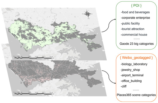 Figure 3. Distribution of POI and geo-tagged images and their semantic categories. - Geo-tagged images: Geo-tagged data derived from the Weibo, a famous social media in China. Weibo-geo-tagged image dataset comprises images shared by users on the Weibo platform. We extracted 75,663 images from Weibo check-in data from December 2022 to March 2023. After the data cleaning and screening, 41,055 valid images were obtained. The spatial distribution of the images and scene categories are shown in Figure 3.