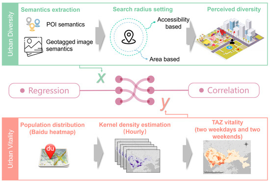 The unprecedented urbanization of the world since the 20th century has led to the formation of world-famous megacities such as New York, Tokyo, and London. The growth of these megacities has witnessed economic prosperity and cultural diffusion, symbolizing the progress of human society. However, with the accelerated pace of urbanization, human–land conflicts become increasingly pronounced in urban areas. Issues such as urban sprawl, residential vacancy, population loss, and ecological degradation [1,2,3] have further intensified these challenges, making urban development more difficult and less sustainable. Consequently, the enduring focal point of urban research has been the precise evaluation of the correlation between human activities and urban space [2,4,5,6]. During the 1960s, Jacobs introduced the concept of urban vitality to delineate the facets of interactions between humans and the urban environment [7]. Following that, urban vitality has found extensive applications across the domains of psychology, sociology, geography, and urban planning, yielding diverse interpretations to the concept [6,8,9,10]. However, identifying the underlying factors that influence urban vitality has been a challenging question for researchers [4,10,11]. For example, many have evaluated factors that effectively promote urban (neighborhood) vitality, including the road network structure [12,13], the accessibility of facilities [5], building density [6], urban diversity [14], and urban form [15,16]. Among others, urban diversity has attracted much attention and is acknowledged by researchers as a primary factor influencing urban vitality [17,18,19].