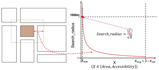 where denotes the area of the current spatial unit; and denote the mean and standard deviation of the areas of all spatial units; the constant C specifies that the search radius is limited to 1000 when takes the minimum value (); the search radius is set to 0 when . Figure 5 illustrates the search radius as a function of the area of the spatial unit. Then, the geo-tagged data fall in the extended radius are considered in Equation (1) to calculate the diversity (i.e., AREA_SHDI).