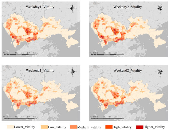 The spatial distribution of TAZ vitality on weekdays and weekends is depicted in Figure 6, and the vitality values are classified into five categories (higher, high, medium, low, and lower). In general, the southwest corner and central-southern parts of Shenzhen exhibited higher vitality on both weekdays and weekends, representing the core urban areas with concentrated human activity, while the eastern and northwestern parts displayed extensive areas of low vitality. In addition, the distributions of vitality were relatively decentralized on weekdays, with a higher concentration of human activity in the central and western parts, as well as in the central urban areas in the south. On weekends, vitality is more concentrated in the southern part of the city, with a slight decrease in the value of vitality in the areas around the central urban areas compared to weekdays.