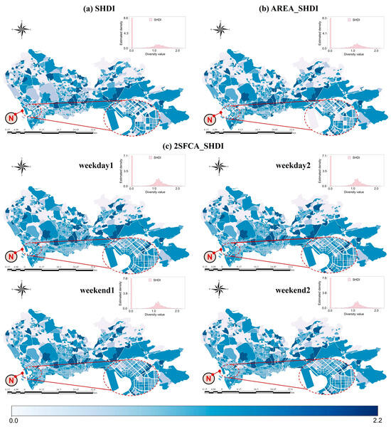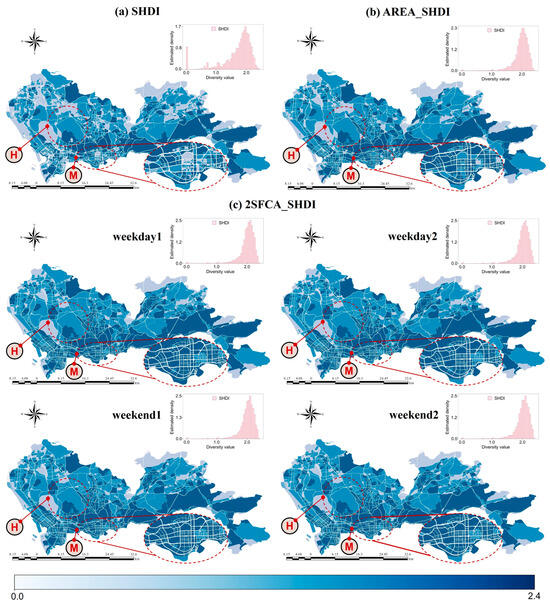 The accessibility-based diversity indicator (2SFCA_SHDI) calculated from POIs and geo-tagged images are shown in Figure 7c and Figure 8c, respectively. Since 2SFCA_SHDI depends on dynamic population distribution, diversity was estimated for the four sample days (i.e., weekday1, weekday2, weekend1, and weekend2). First, the histograms in Figure 7c and Figure 8c exhibit a shift and concentration towards higher values, respectively. Second, it is clear that the diversity values in the central urban areas of Shenzhen (M in Figure 7c) are significantly higher than the SHDI estimations and are slightly higher than AREA_SHDI (Table 2). Third, the spatial distribution of the accessibility-based diversity in N (Figure 8) is smoother than that obtained by SHDI and AREA_SHDI, respectively. This suggests that spatial dependency (autocorrelation) is better incorporated into 2SFCA_SHDI due to the use of accessibility, which went beyond local computations and produced more reasonable results, especially in densely populated areas.